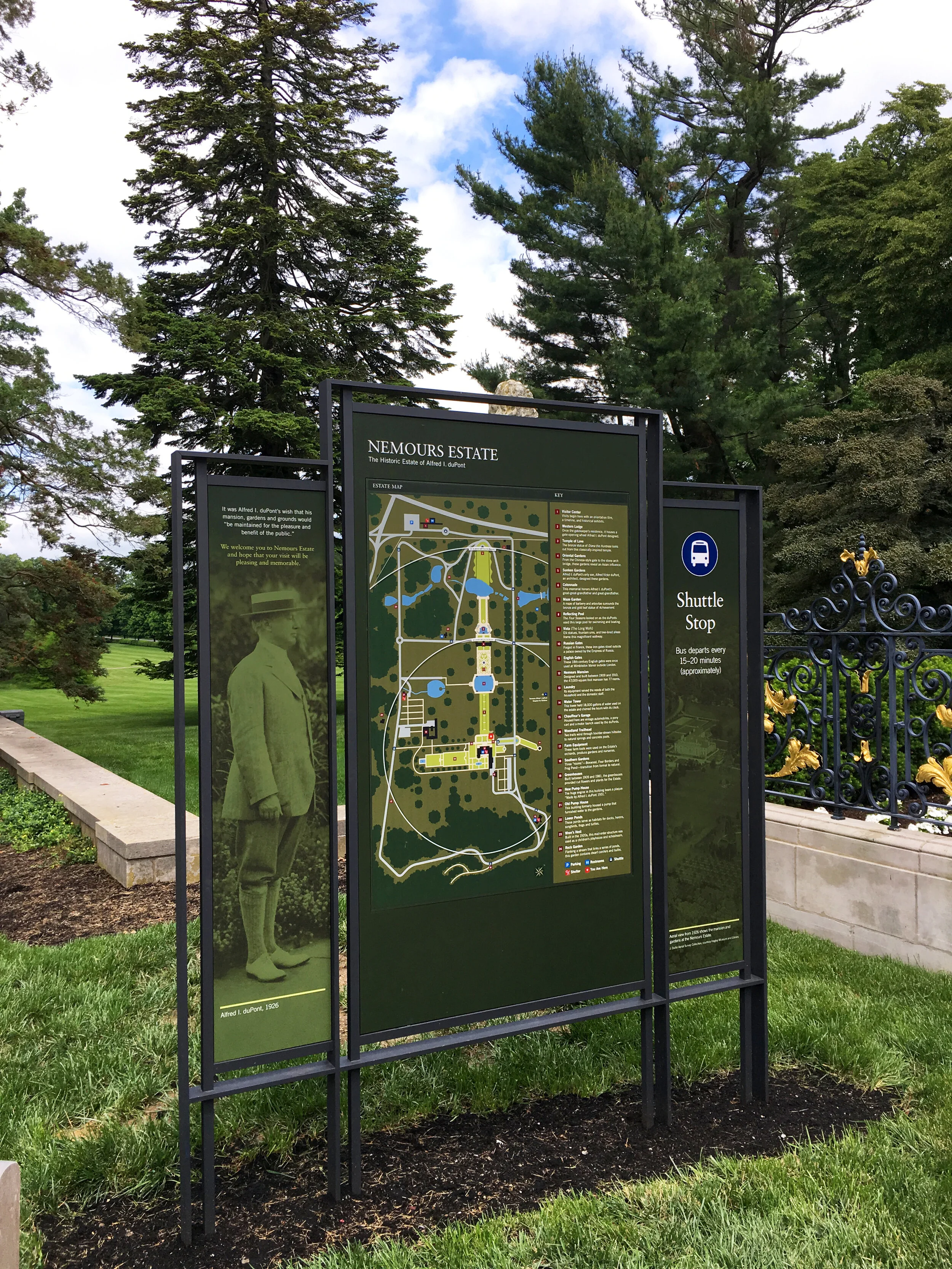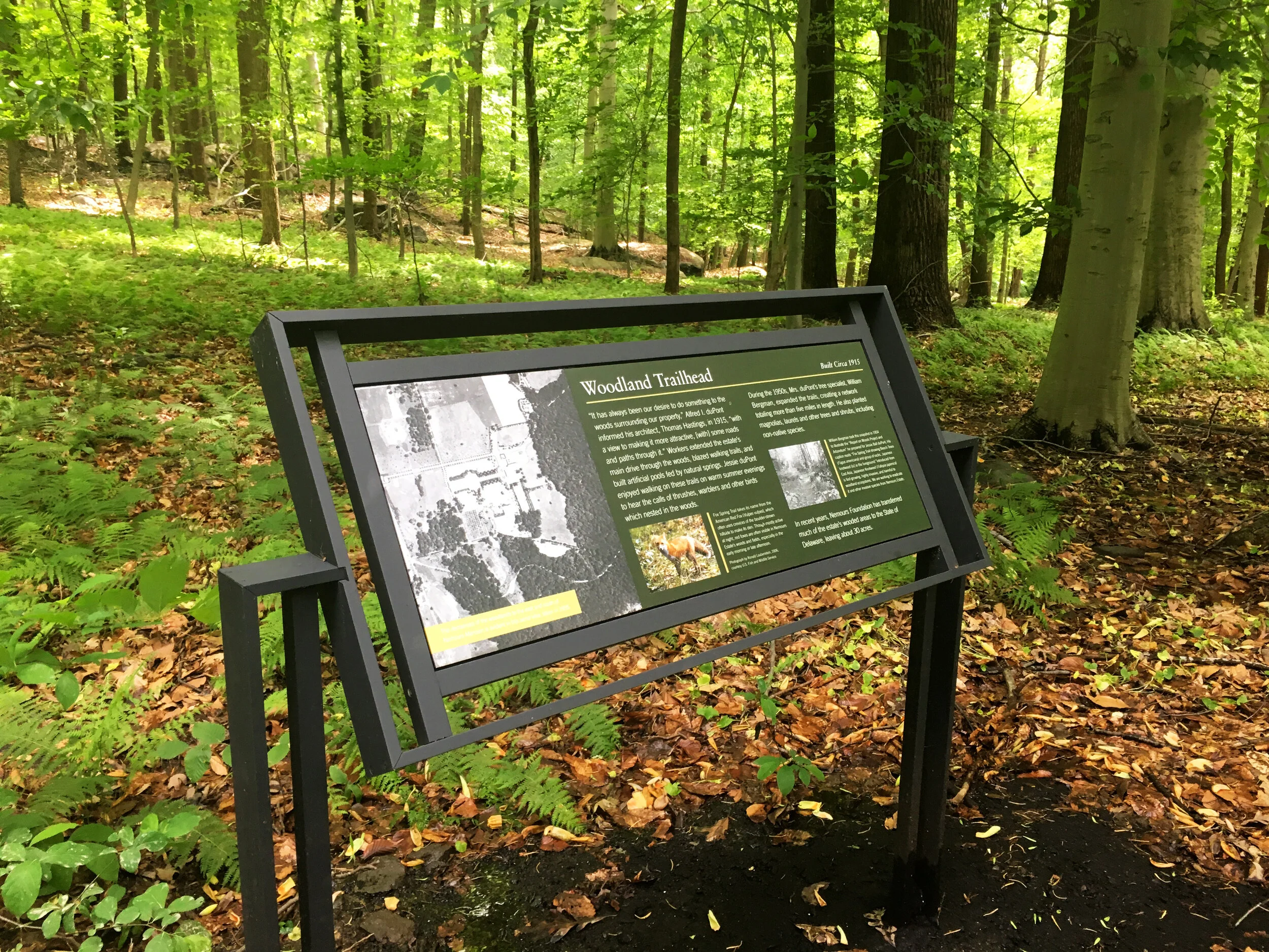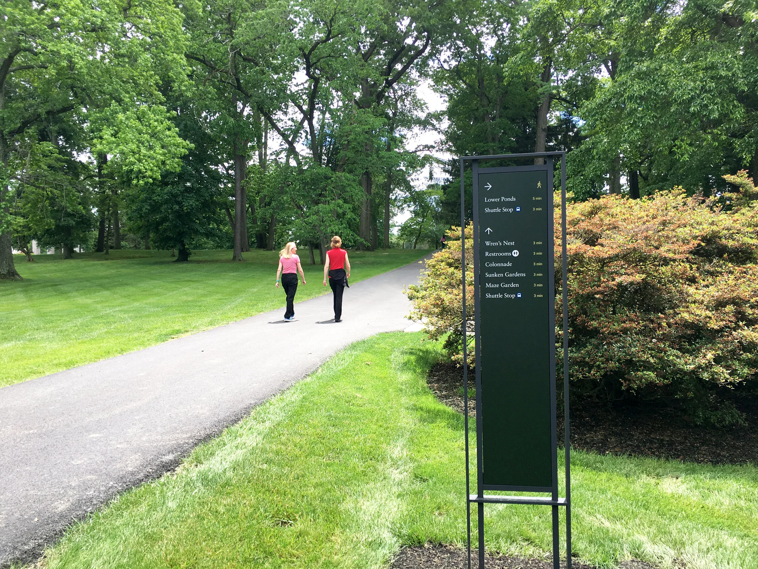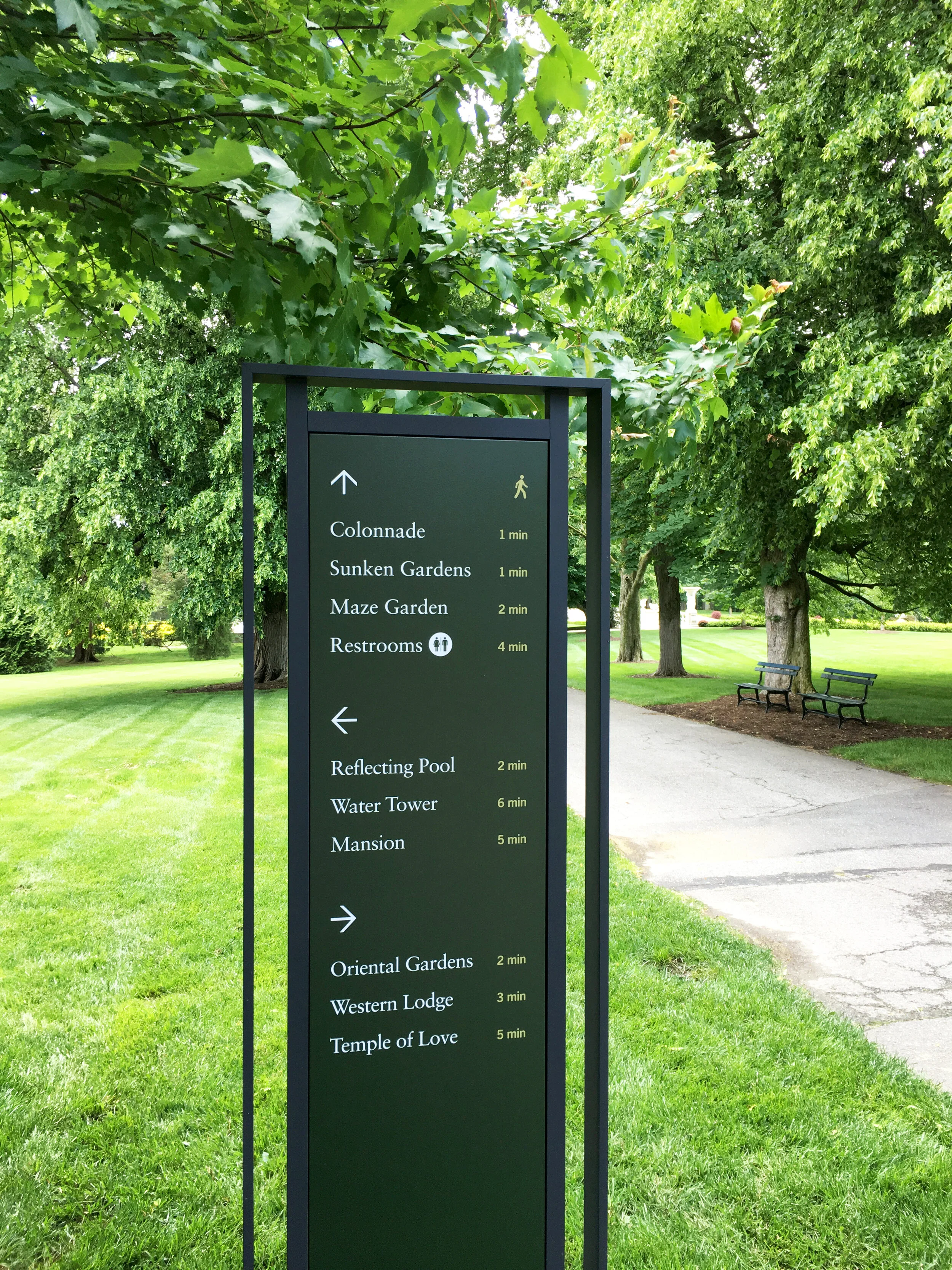 Signage, maps, and printed guides support navigation, as well as interpretive signage to identify notable elements and structures throughout the Estate. The signage uses minimalist structures and a subtle color palette that blends with the grounds and overall surroundings.